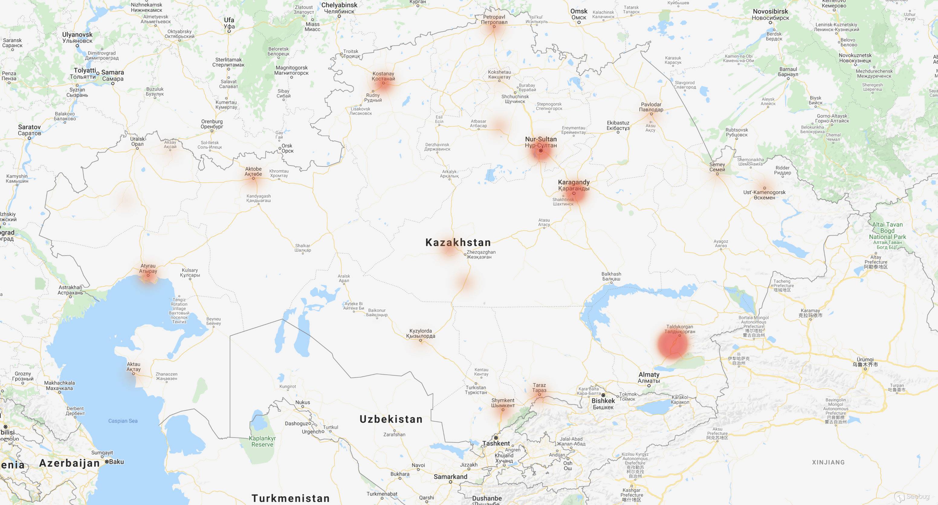 哈薩克斯坦北部靠近俄羅斯邊界的彼得羅巴甫爾、東部塞米伊、東部厄斯克門(俄語舊語:烏斯季卡緬諾戈爾斯克)雖然也存在網絡設備聚集,但沒有發生抗議游行等活動。