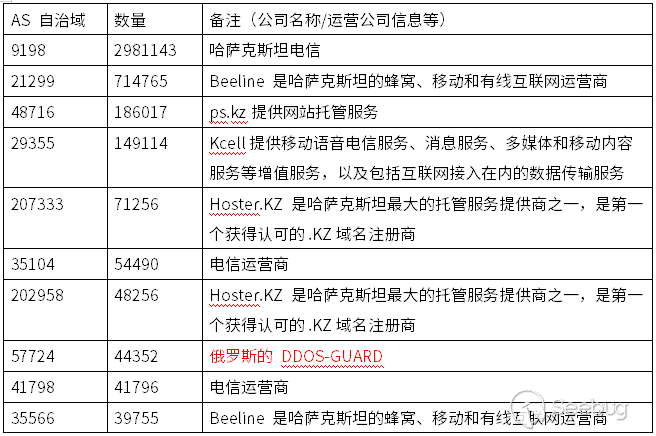 哈薩克斯坦的自治系統分布如下:大致和上述的互聯網提供商一致,但也出現了俄羅斯的抗DDoS網段。