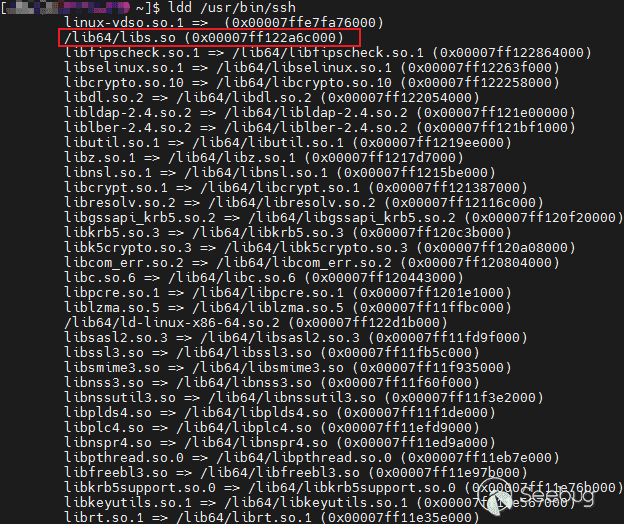 2021年4月,某海外安全廠商曝光了一種新型遠控程序Facefish,他們懷疑攻擊者正在進行僵尸網絡組網,并計劃在組網完成后,以“訪問權限即服務”(access-as-a-service)的方式出售該網絡的訪問權限。Facefish遠控通過第一階段的dropper釋放出一個Rootkit,Rootkit利用用戶態常用的動態鏈接庫劫持技術,實現ssh、sshd的運行時鏈接程序劫持,最終在受害主機上放置一個后門。事實上,對于一個Rootkit程序,Facefish的這種用法十分原始,因為它僅利用了Rootkit的觸發機制,惡意so文件中還可以增加一系列隱藏功能。動態鏈接庫劫持效果如圖: