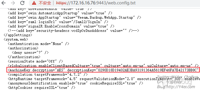 在C:\Program Files\Veeam\Backup and Replication\Enterprise Manager\WebApp\web.config中有machineKey,然后就是懂得都懂了,把web.config復制一份寫入到1.txt中,然后通過web訪問拿到machineKey