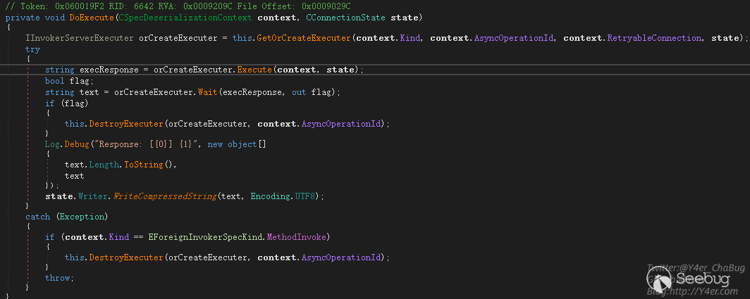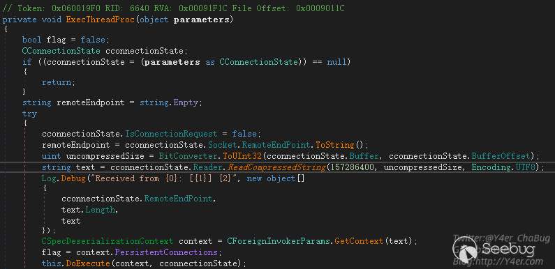 tcp壓縮數據流通過ReadCompressedString讀出字符串,然后通過CForeignInvokerParams.GetContext(text)獲取上下文,然后交由this.DoExecute(context, cconnectionState)進行分發調用。