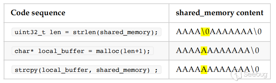 共享內存的雙取 (Double Fetch) 是?類?常典型的安全漏洞成因。下表展?了?個簡單的雙取漏洞:第?個?調?strlen計算共享內存中?個字符串的長度;第??根據該長度分配?個本地堆內存;第三?調用strcpy把共享內存中的字符串復制到新分配的本地內存中。這三?代碼的問題在于,因為C string以\0為截?符,strlen掃描字符串時以第?次遇到的\0計算當前字符串的長度,同樣, strcpy 復制字符串時,直到遇到的\0才會終?復制。?共享內存另?端控制者,可以在strlen和strcpy之間,把第?個\0修改為?零字符,這導致strcpy會復制過多字符到 local_buffer 中,造成堆溢出。