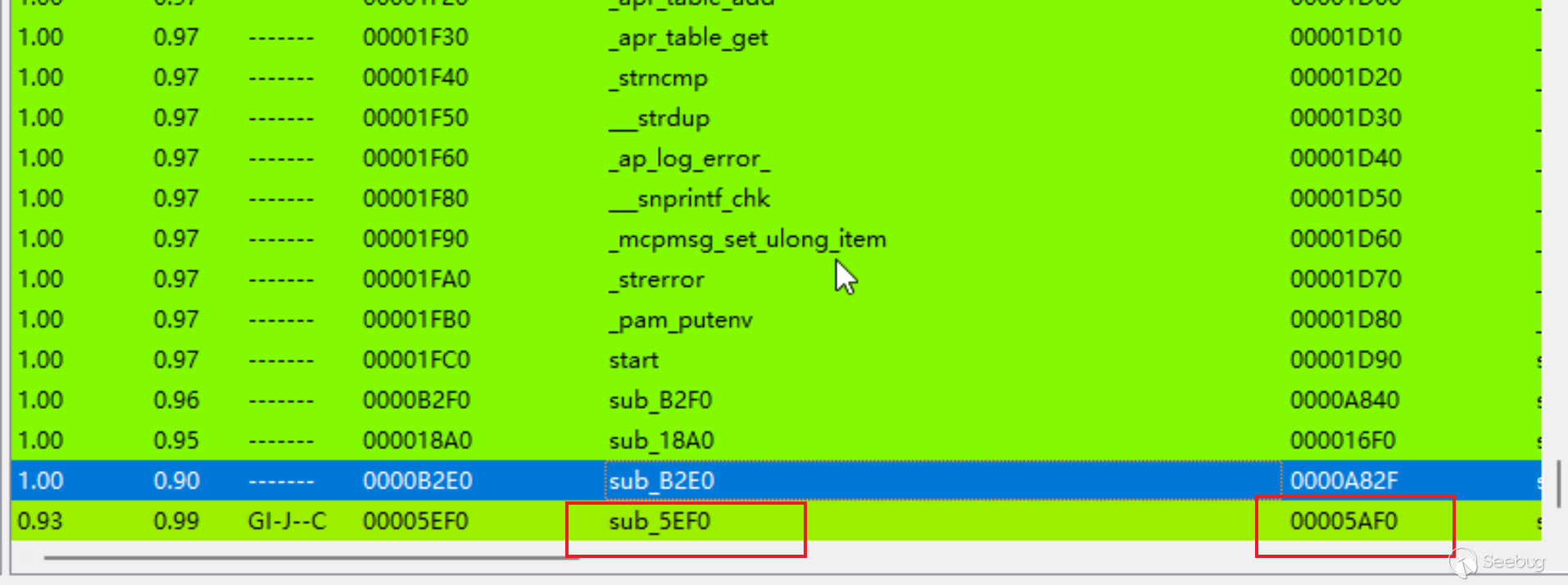 在ida中使用bindiff插件對比新舊兩個so文件,能夠發現只有sub_5EF0和5AF0改動比較大