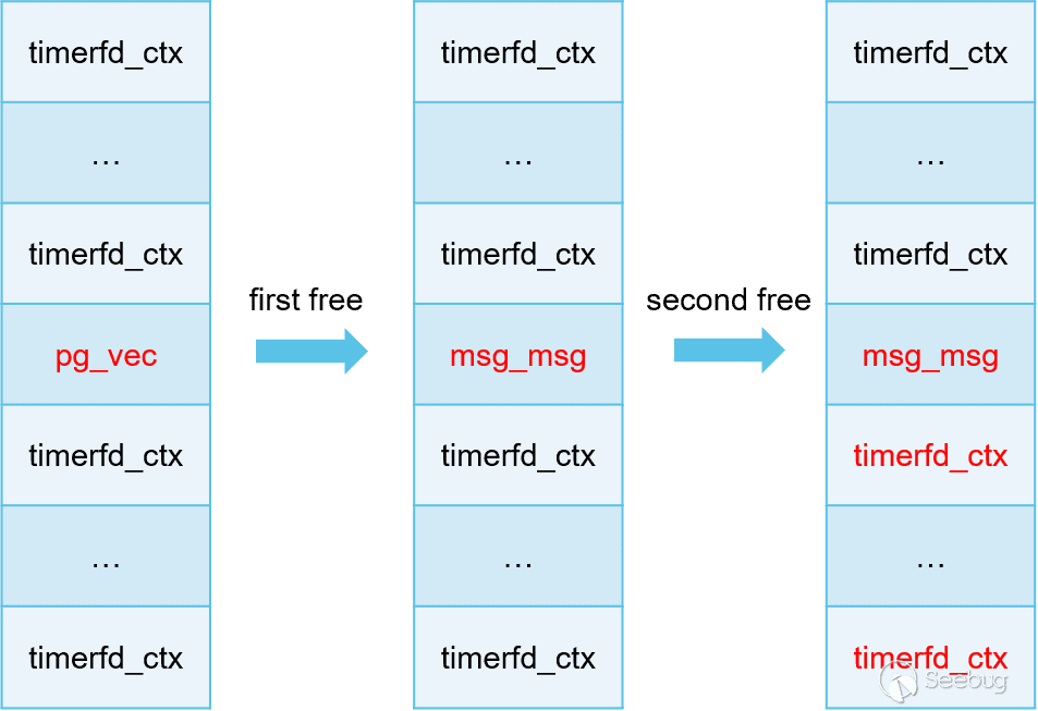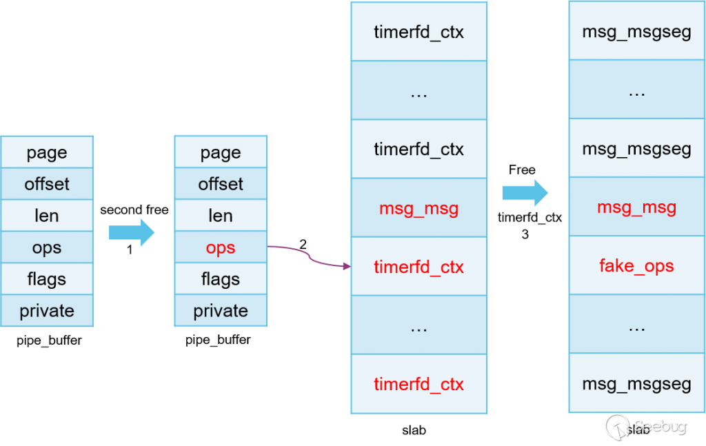 - 再次釋放pg_vec,使用msg_msgseg進行堆噴,修改pipe_buffer的ops成員指向剛剛泄露地址的timerfd_ctx。