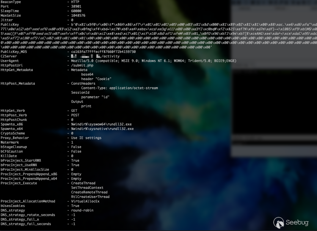 而下載的文件約211kb,解析后可以看到回連地址、加密字段、公鑰等配置信息。