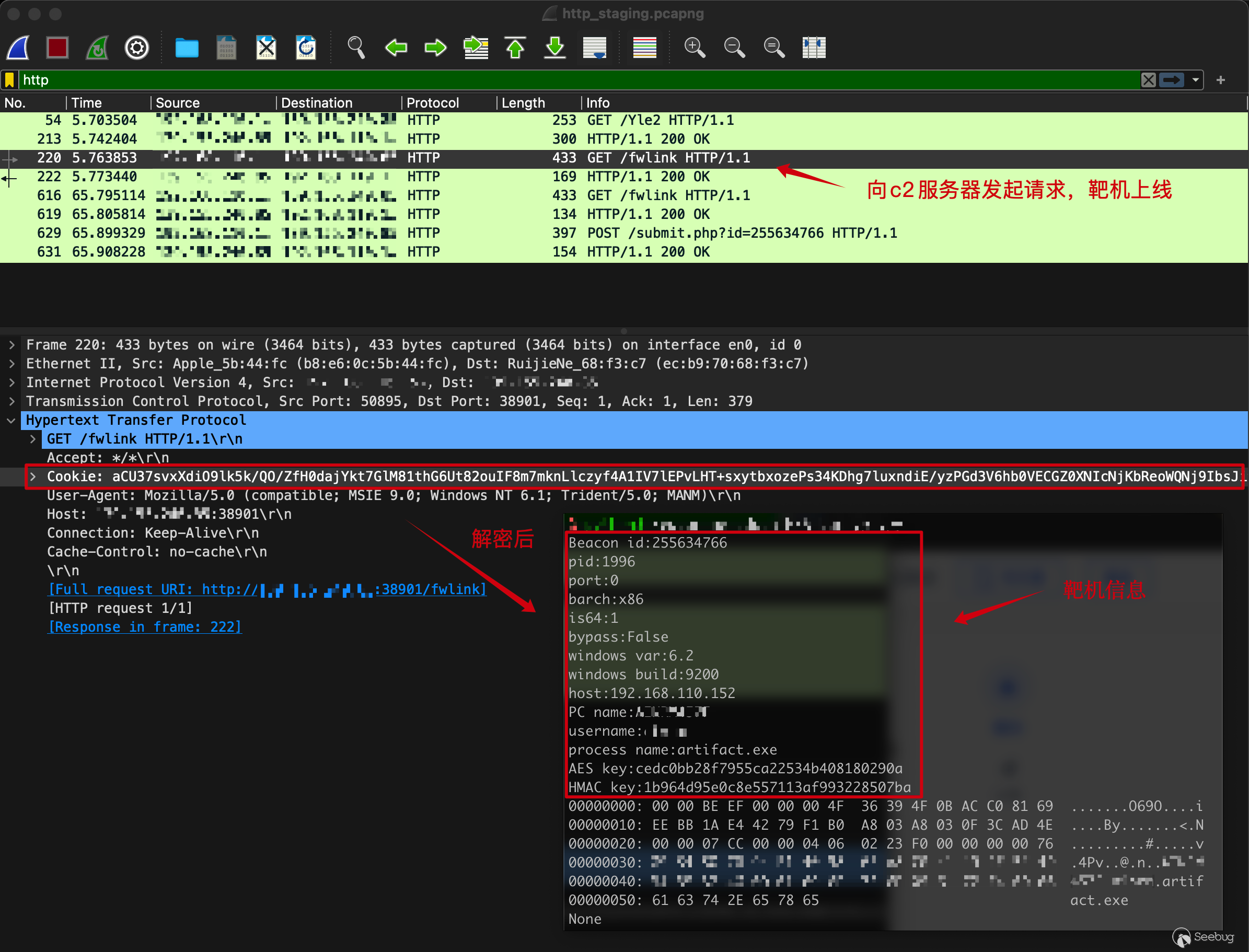 隨后beacon按設置的頻率以get方法向c2服務器發起心跳請求,通過cookie攜帶靶機信息。