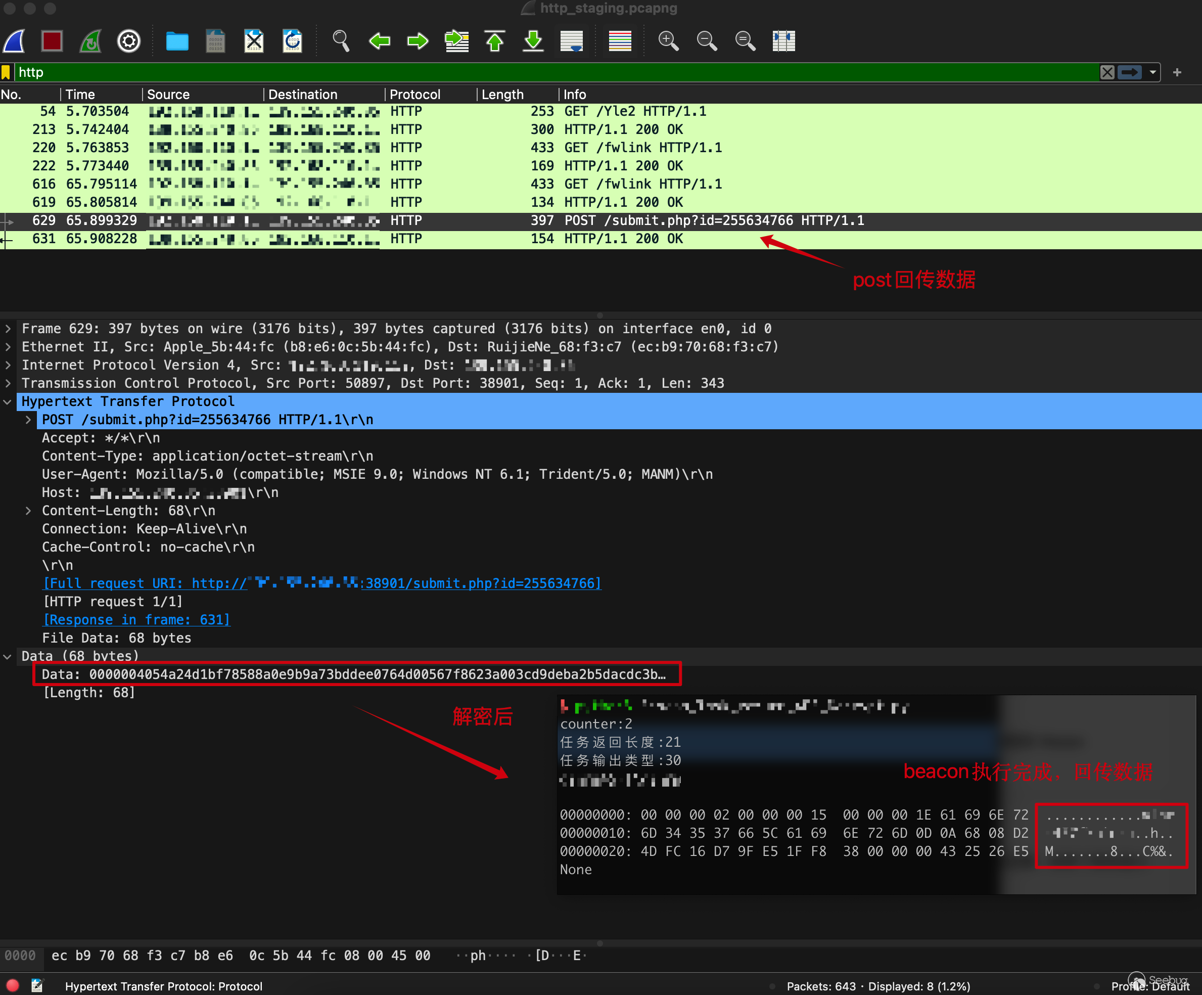 識別出心跳請求、結果回傳、元數據提交、payload下載四種cs流量。