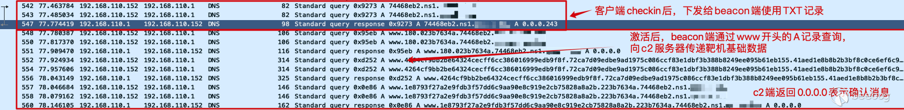 客戶端控制臺輸入checkin或其他指令激活窗口,dns-beacon服務器支持A、TXT、AAAA三種方式下發payload,激活后默認使用TXT記錄,流量中表現為0.0.0.243,除此之外還可以通過mode指令切換為A、AAAA記錄,流量中表現為0.0.0.241、0.0.0.245,隨后beacon端發起以www為首的A記錄請求,向c2服務器傳遞靶機基礎信息。