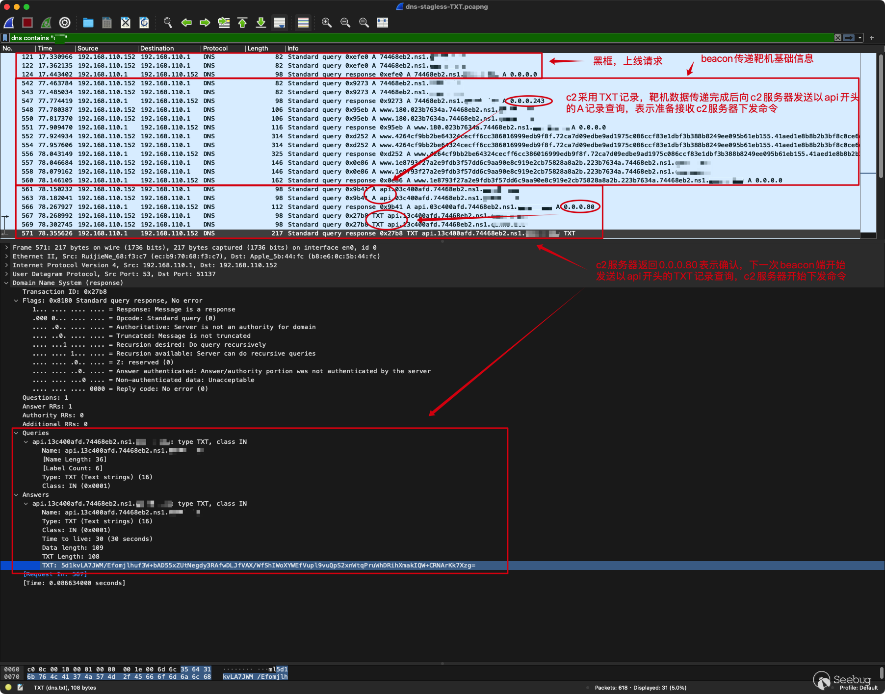 beacon準備接收c2任務,先發送以api開頭的A記錄請求告知c2服務器可以開始下發任務,即圖中的0.0.0.243-TXT方式,隨后發起以api開頭的TXT記錄請求等待c2服務器返回數據。