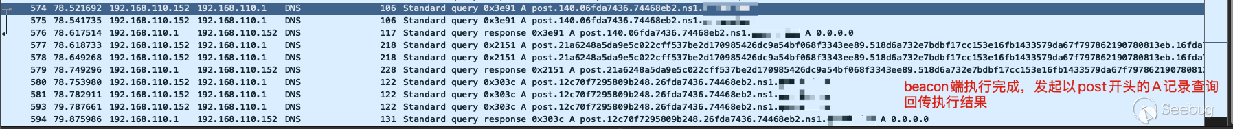 beacon端執行完命令后,再向c2服務器發起以post開頭的A記錄查詢回傳執行結果。