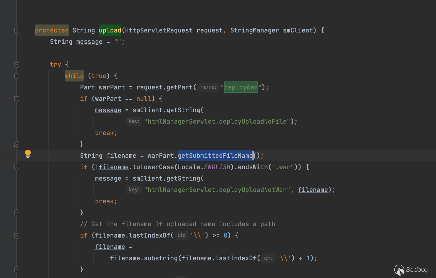 在文件上傳時最終會通過處理org.apache.catalina.manager.HTMLManagerServlet#upload