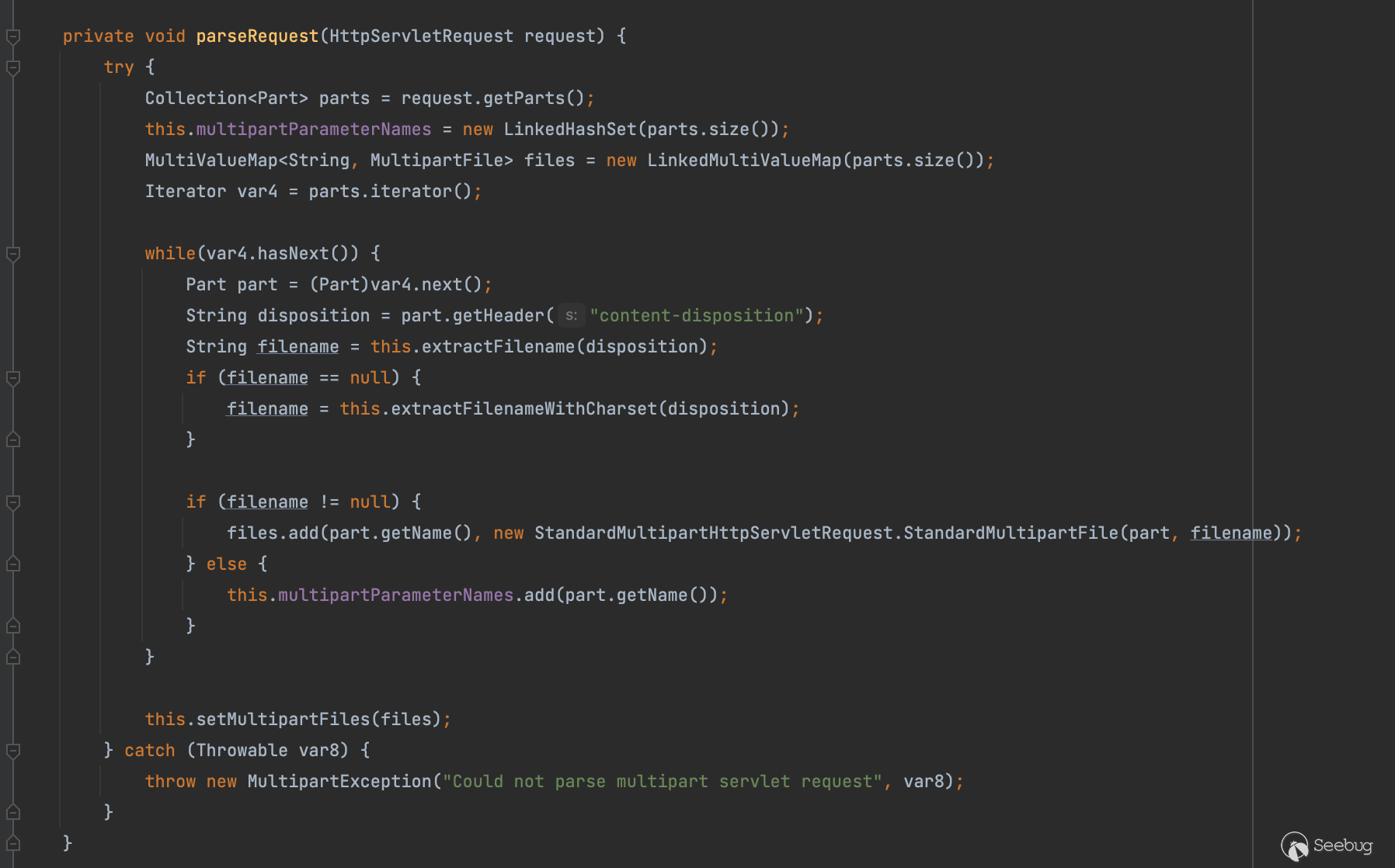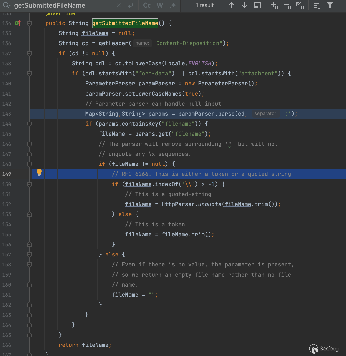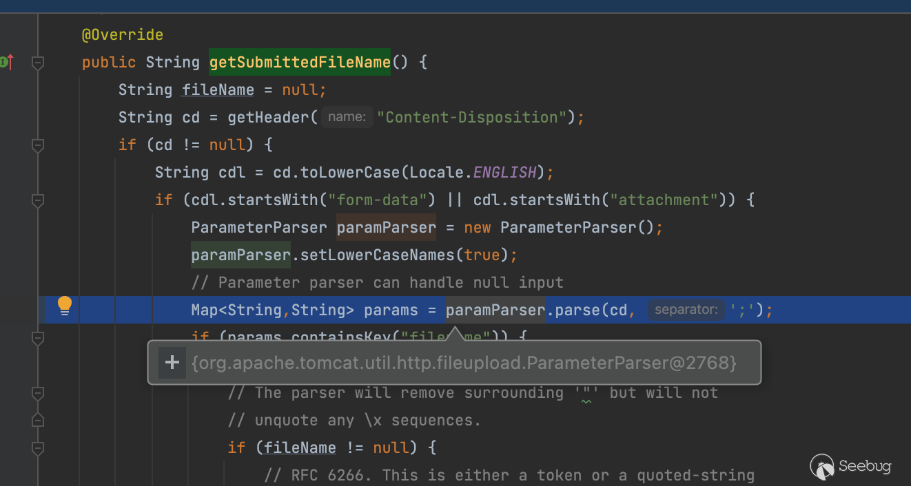 還是在org.apache.catalina.core.ApplicationPart#getSubmittedFileName當中,一看到這個將字符串轉換成map的操作總覺得里面會有更騷的東西(這里先是解析傳入的參數再獲取,如果解析過程有利用點那么也會影響到后面參數獲取),不扯遠繼續回到正題