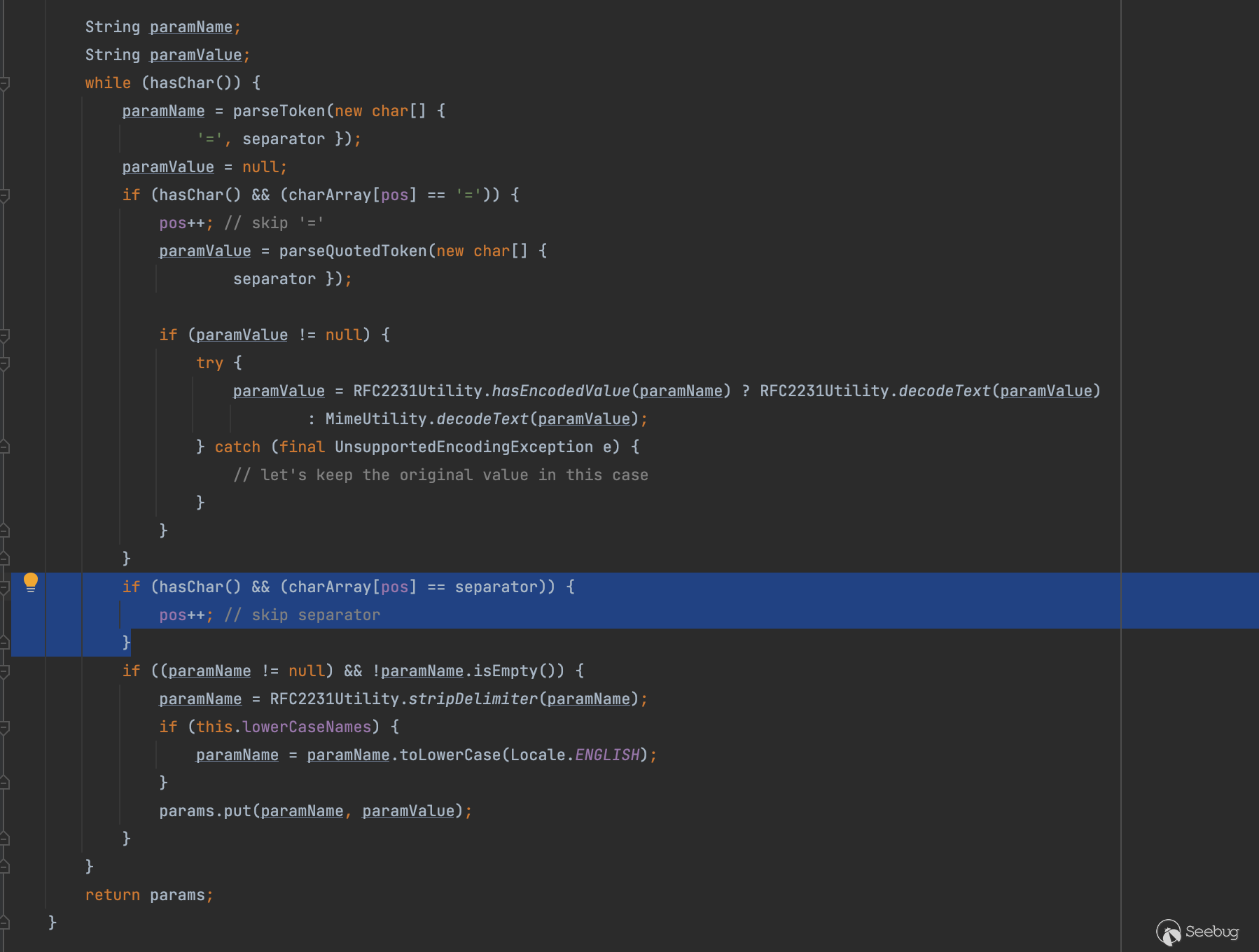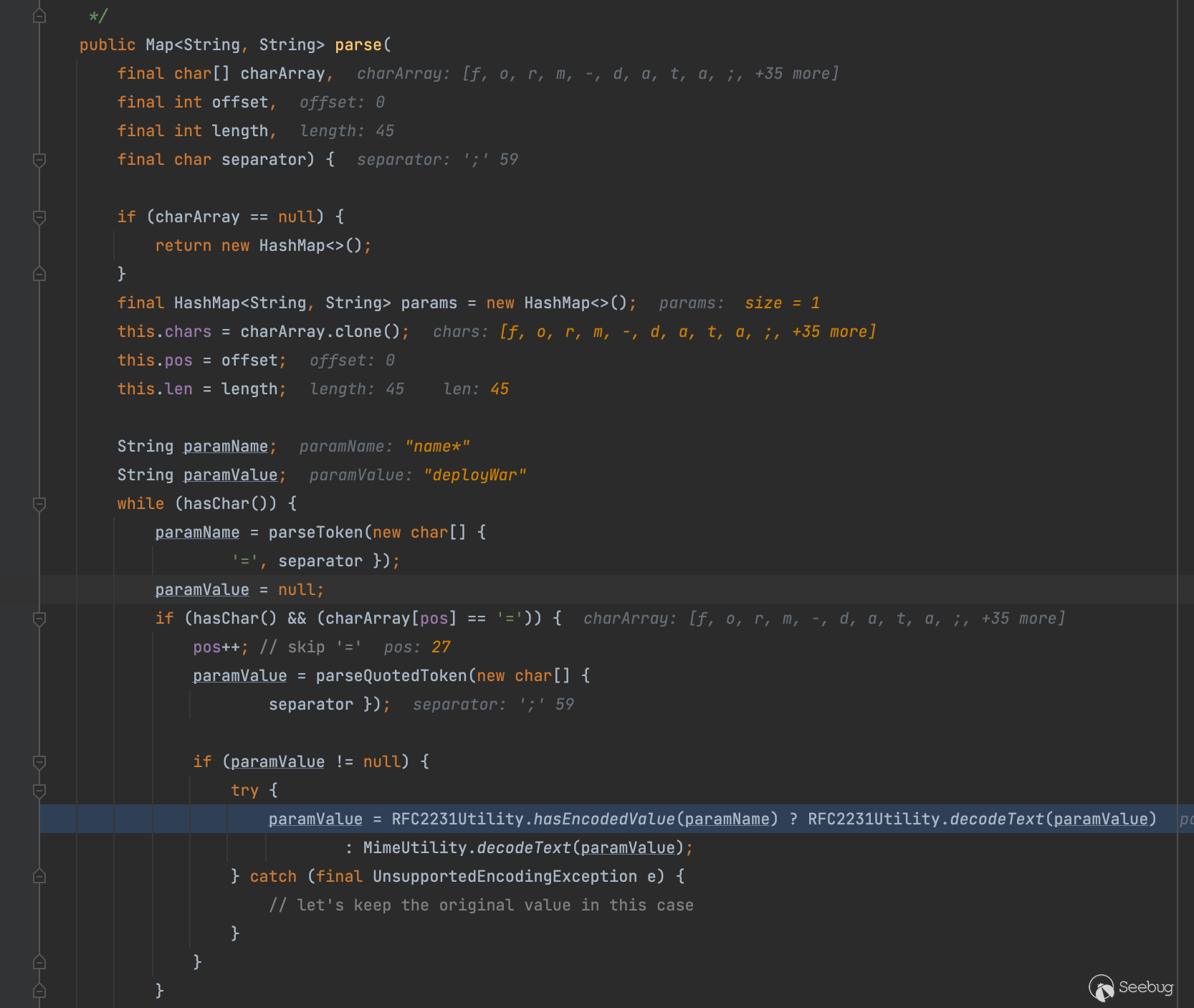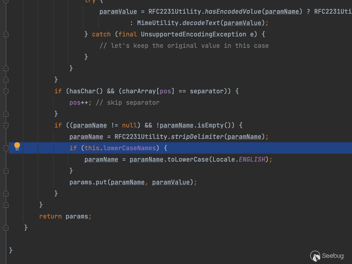首先它會獲取header參數Content-Disposition當中的值,如果以form-data或者attachment開頭就會進行我們的解析操作,跟進去一看果不其然,看到RFC2231Utility瞬間不困了