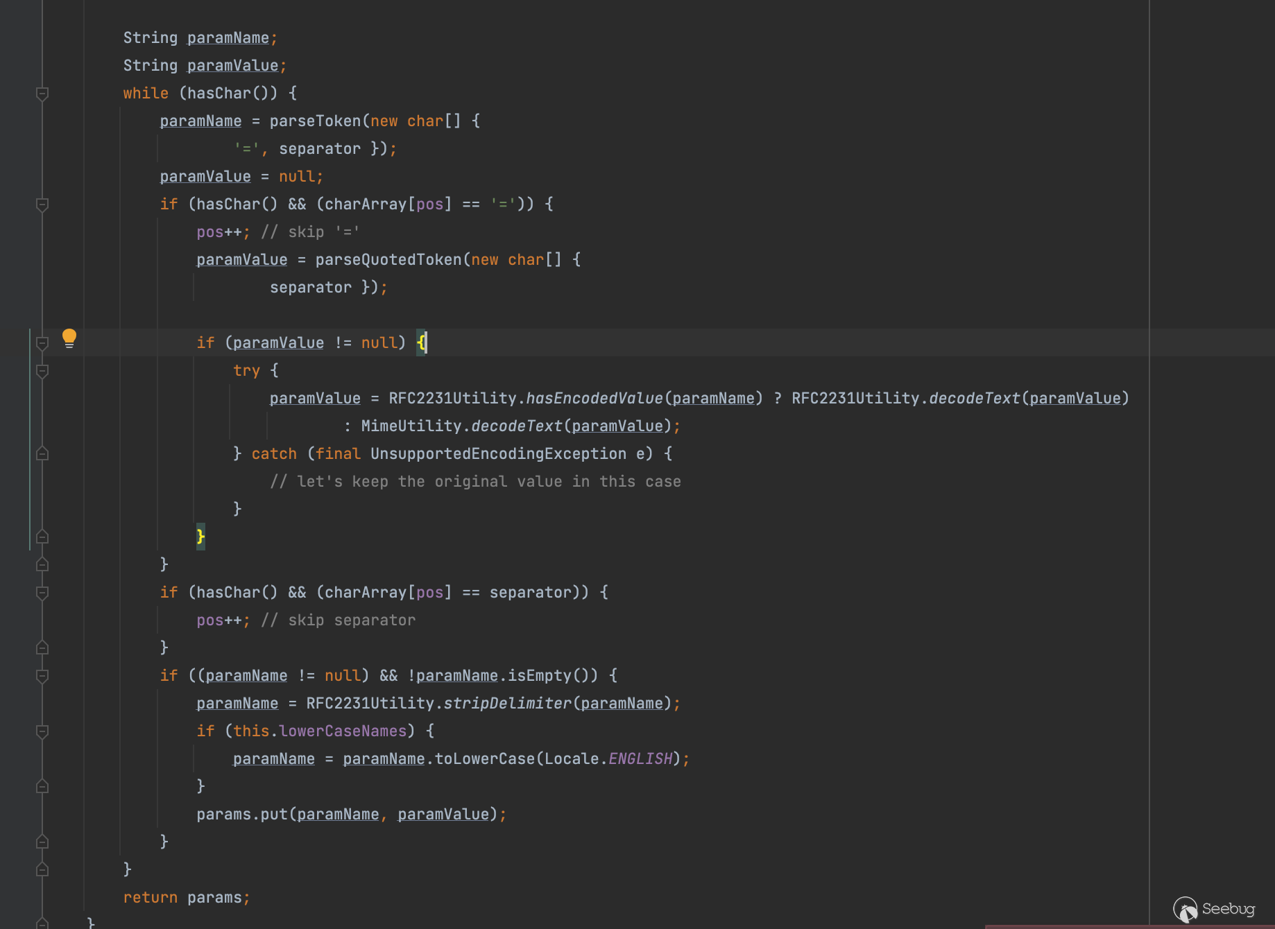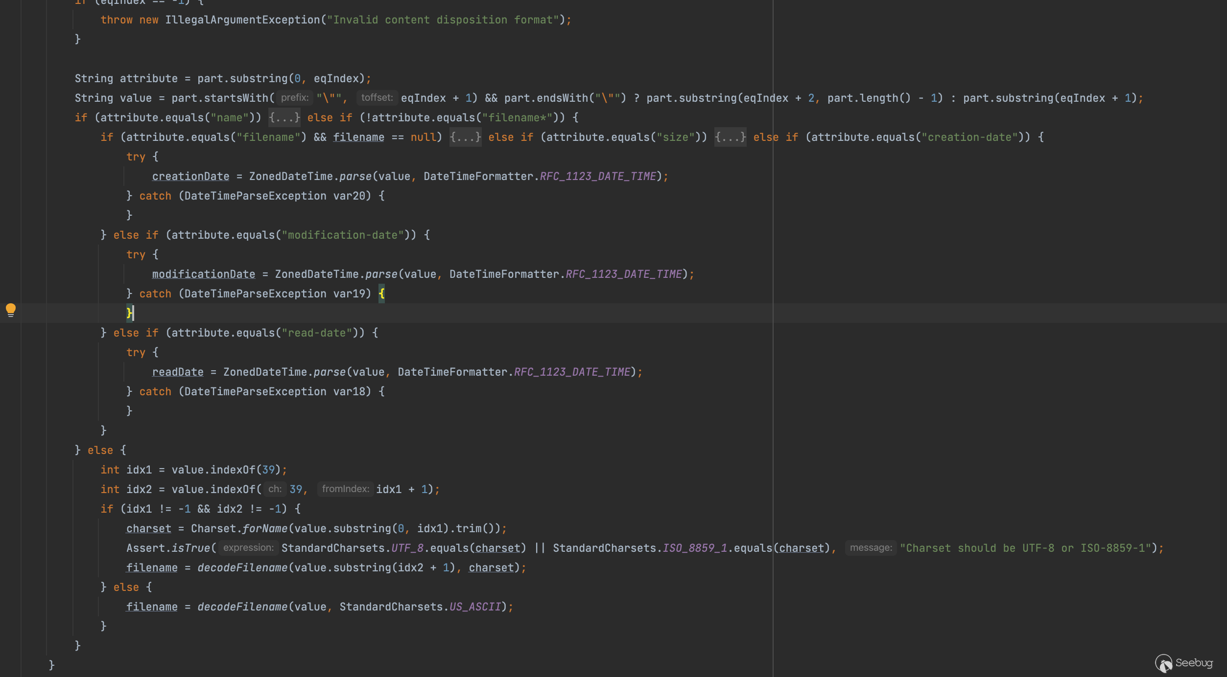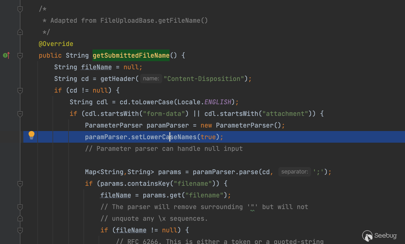 首先它會獲取header參數Content-Disposition當中的值,如果以form-data或者attachment開頭就會進行我們的解析操作,跟進去一看果不其然,看到RFC2231Utility瞬間不困了