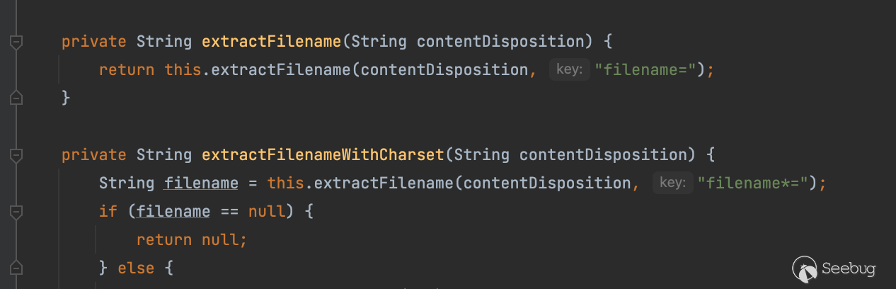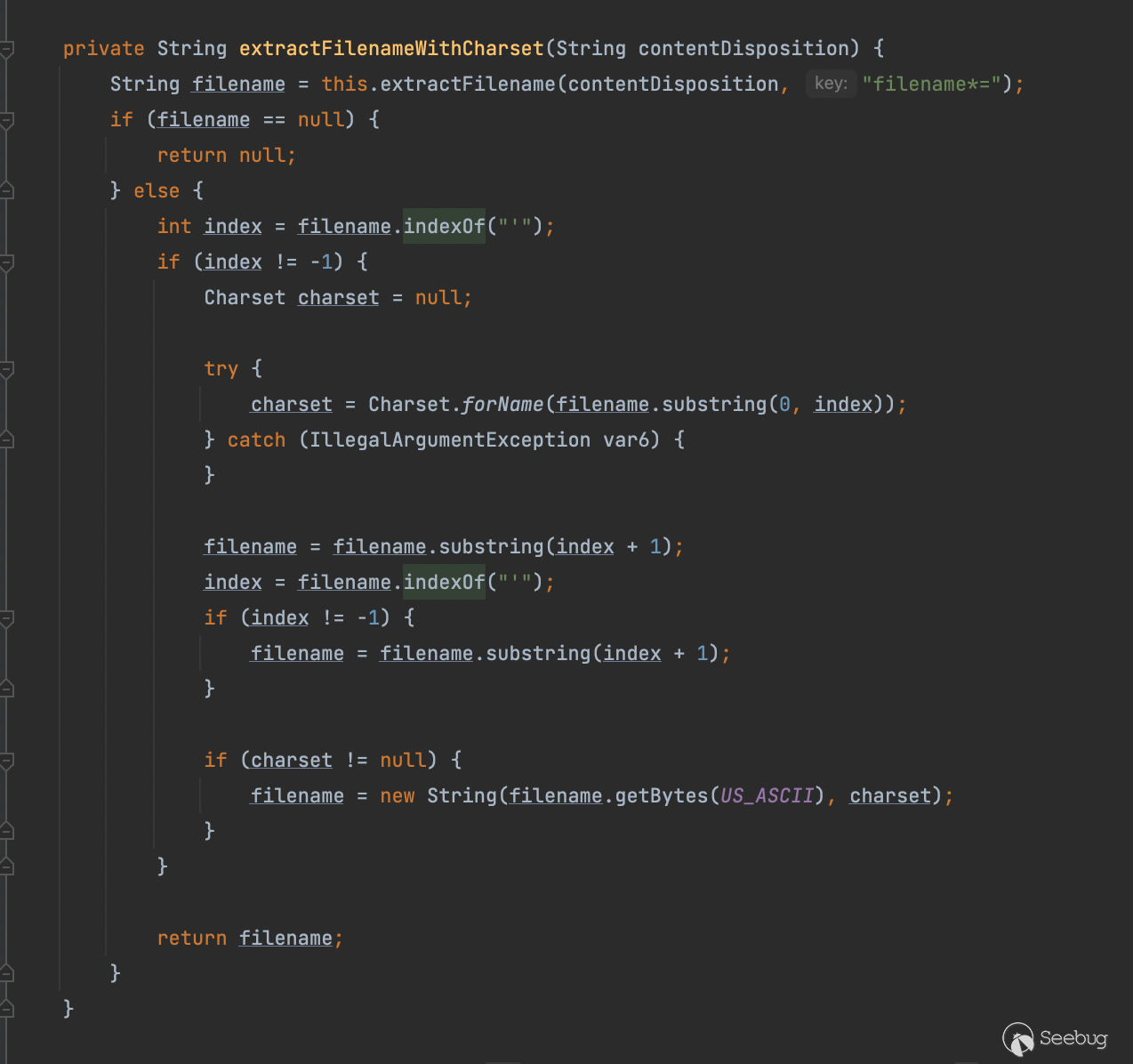 我們來看看這個extractFilename函數里面到底有啥騷操作吧,這里靠函數indexOf去定位key(filename=/filename*=)再做截取操作