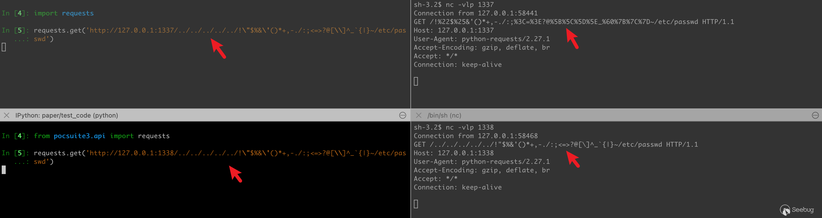 Pocsuite3 hook 了 urllib3 和 requests 的部分代碼,支持 ../,同時取消了對特殊字符的編碼。