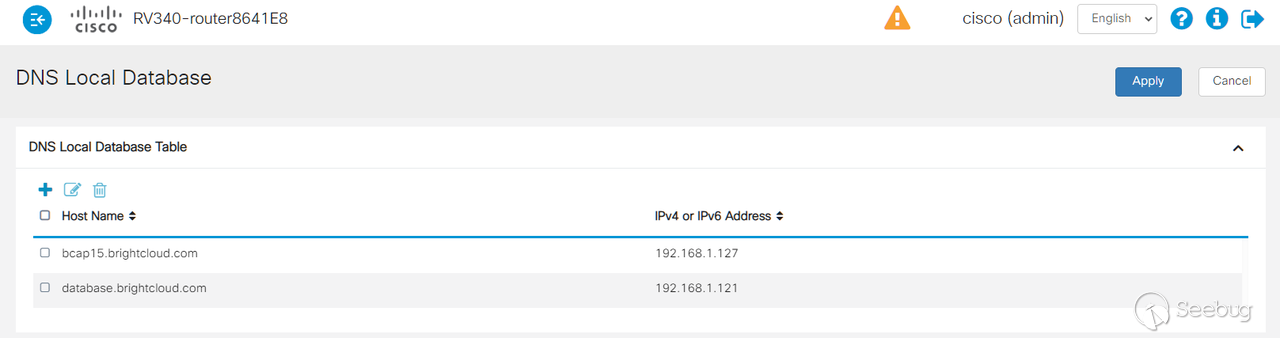 第二種改DNS的方法,只能在登錄RV340的后臺之后才能使用,RV340的web管理界面提供了一個DNS local database的功能,可以設置域名解析,