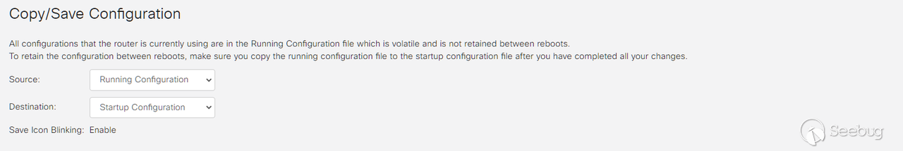 由于RV340更新webfilter database需要重啟,而我們后臺所做的配置是running config,重啟之后配置的域名解析會失效,所以還需要把配置的信息設置成startup config。