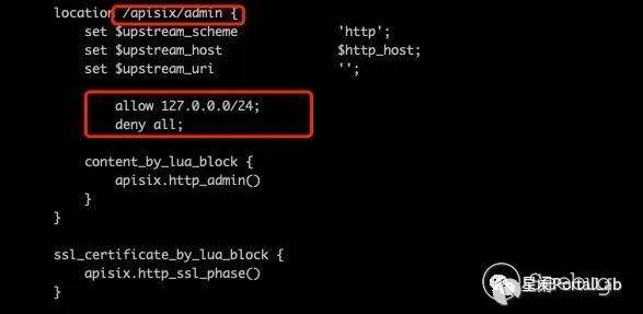 進入到容器中查看,conf/nginx.conf。allow/deny 是設置允許與拒絕訪問的地址。只允許127.0.0.1/24 訪問 /apisix/admin 接口。