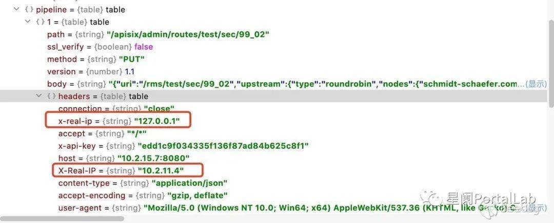 2、通過遍歷data.pipeline和data.headers 、將data.headers 出現的頭信息賦值給data.pipline。發現data.headers中出現了x-real-ip:127.0.0.1 ,這是我們調用batch-requests插件傳遞的頭信息,而此時系統默認的X-Real-IP為大寫。