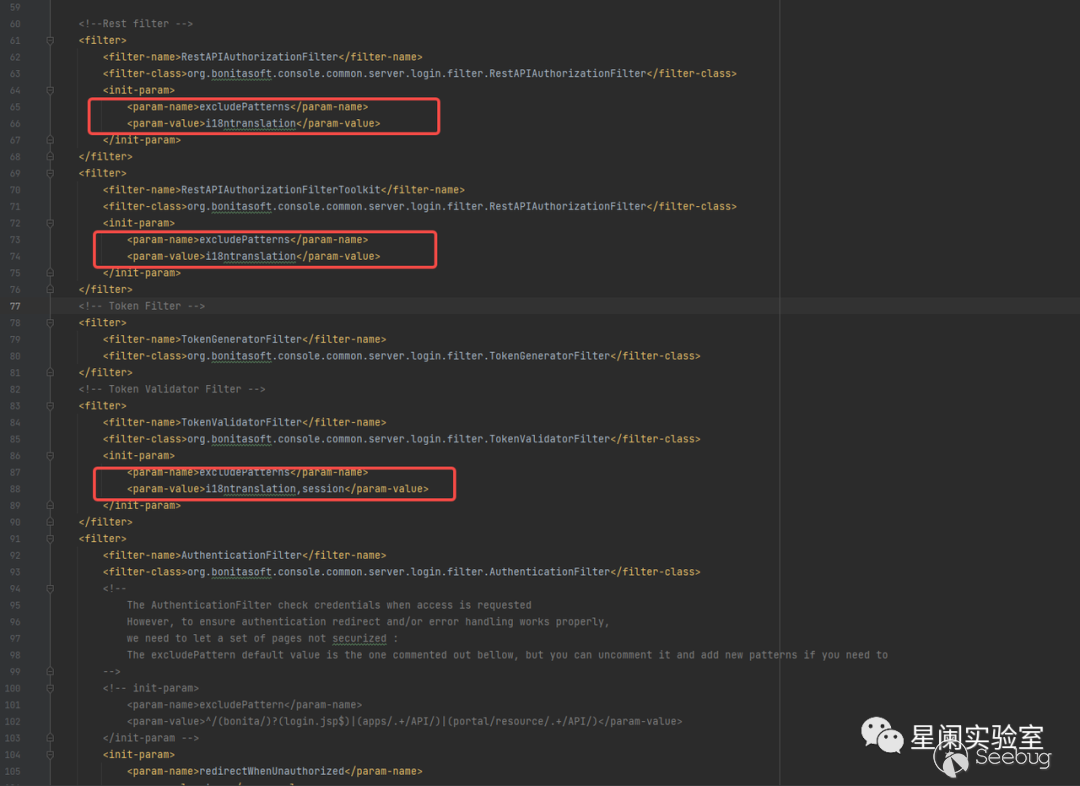 在bonita\BonitaCommunity-2021.2-u0\server\webapps\bonita\WEB-INF\web.xml配置文件中,自定義了filter,并且對參數excludePatterns進行了賦值。