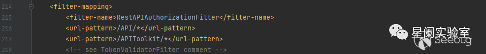 在web.xml的192行和215行定義了/API/*路由下對應的filter為RestAPIAuthorizationFilter、TokenValidatorFilter