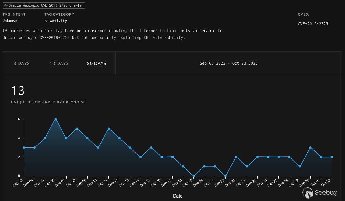 例如,通過GreyNoise數據,我們可以看到CVE-2019-2725爬蟲在過去30天內的常見程度。8220 Gang和其他攻擊者成功地利用了掃描和利用類似的n天漏洞。一種理論可能是,這種類型的攻擊者會尋找像這樣易于破壞的系統,因為它們不太可能很快得到補救,甚至不符合常見的更新實踐。無論漏洞管理處于何種狀態,這些攻擊者都能成功運行。我們可以把這種攻擊看作是目標攻擊的底層。