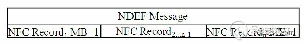 R/W模式下使用NDEF數據結構通信時,NFC設備的每一次數據交互都會被封裝在一個NDEF Message中,一個Message包括多個NFC RecordMessage 的數據結構如下,它是多個record組合而成。