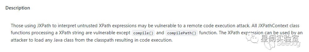 Apache Commons JXPath 存在安全漏洞,攻擊者可以利用除compile()和compilePath()函數之外的所有處理XPath字符串的JXPathContext類函數通過XPath表達式從類路徑加載任何Java類,從而執行惡意代碼。