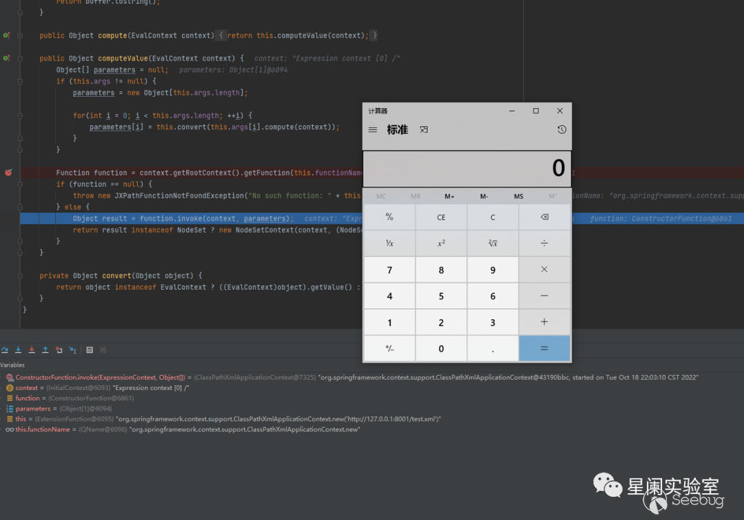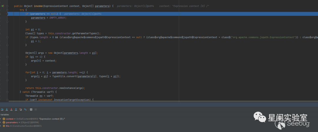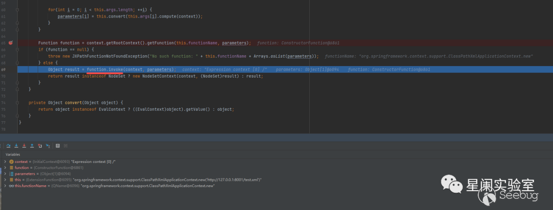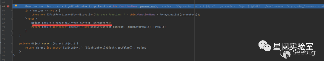 在獲得了org.apache.commons.jxpath.Function對應的這個實例后,會調?具體的invoke實現。