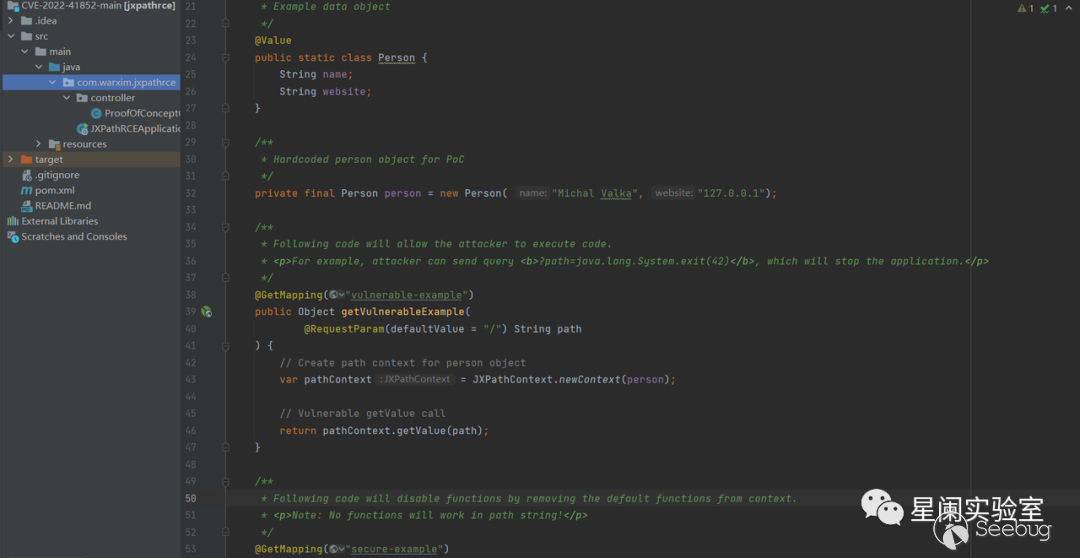 漏洞POC使用Spring框架,簡單實現接受用戶輸入并使用它從Person類中檢索指定的數據。