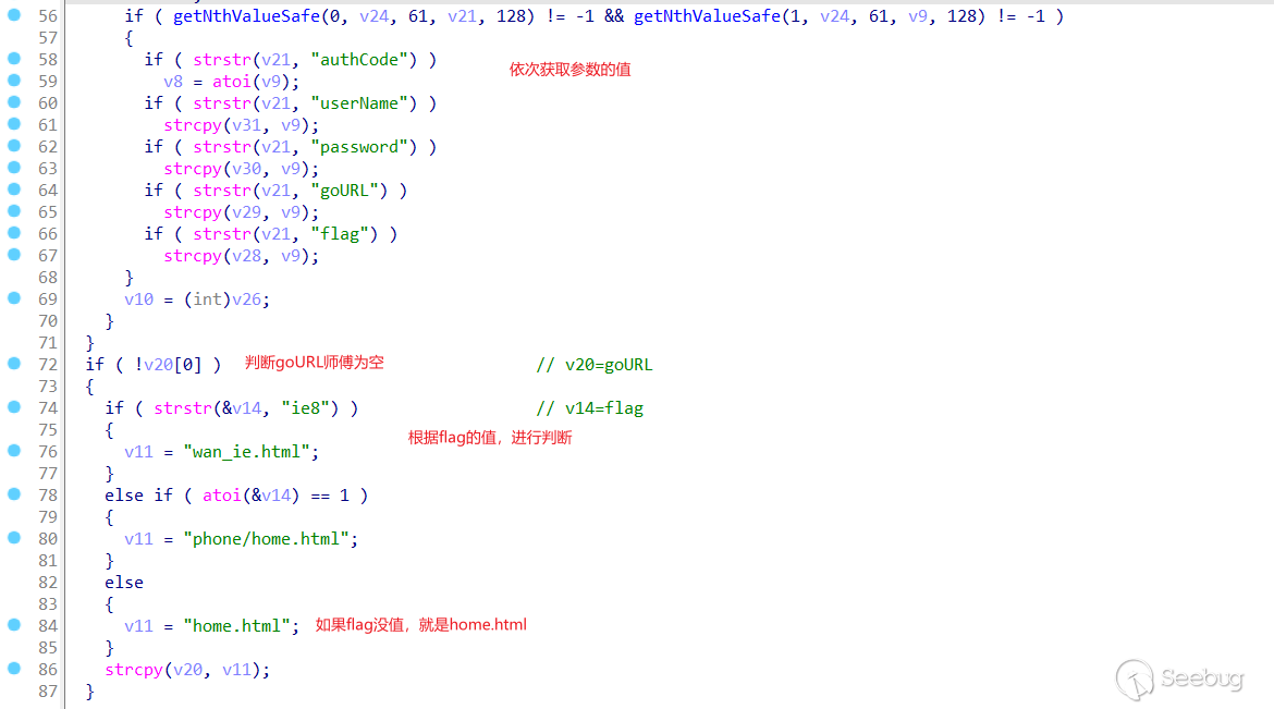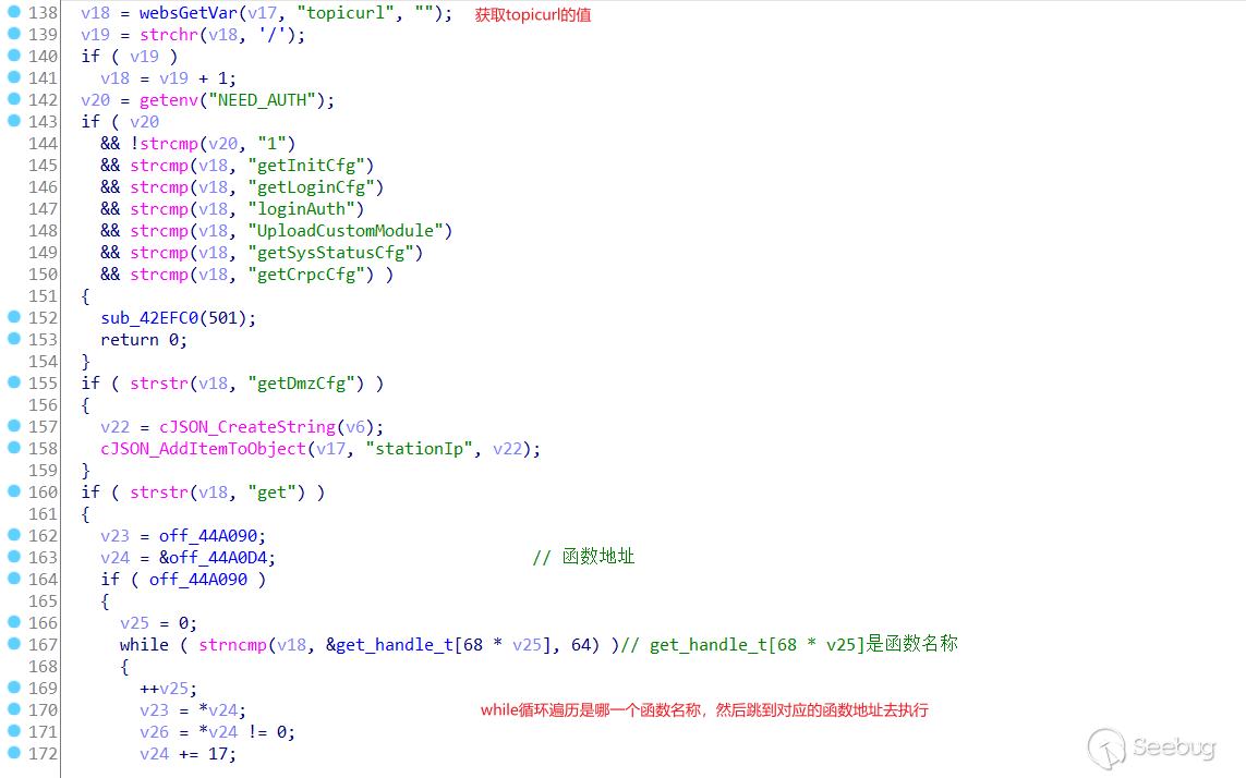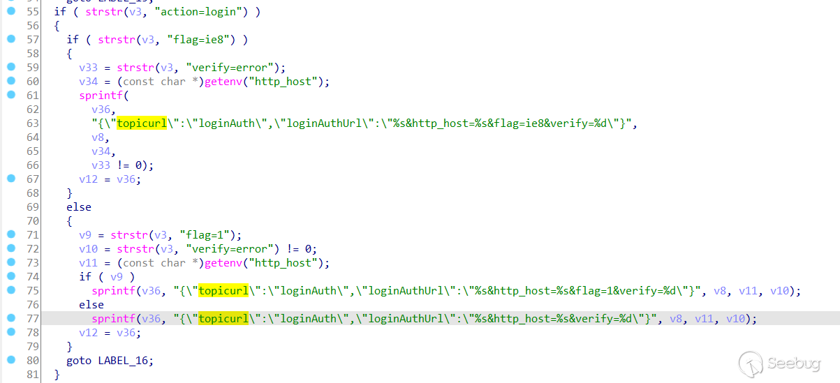 可以看到,這里主要就是用sprinf初始一段語句,我們需要注意的是其中的topicurl,這個后面跟的就是對應接口的字符串,所以我們要去尋找loginAuth對應的處理函數。