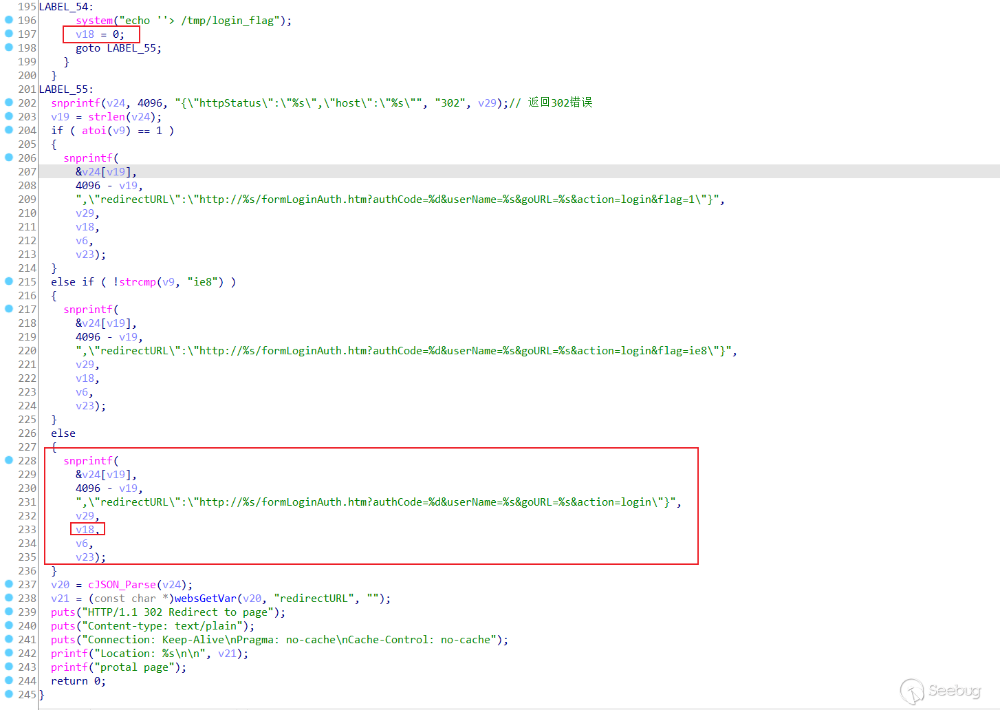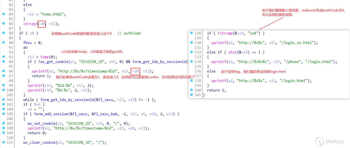 這段代碼會snprintf一個重定向一個url,然后進行訪問,其流程由flag參數的值決定,我們隨便輸入密碼,就會進入第3個redirectURL,需要注意其authCode參數,授權碼,也就是之前v18的值,現在它的值為0。