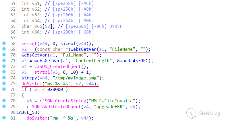 第二個是 /cgi-bin/cstecgi.cgi 的 UploadFirmwareFile 函數,其參數FileName參數可控,并且將作為doSystem的參數被執行。