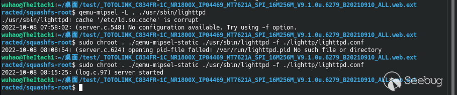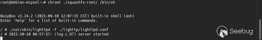 sudo chroot . ./qemu-mipsel-static ./usr/sbin/lighttpd