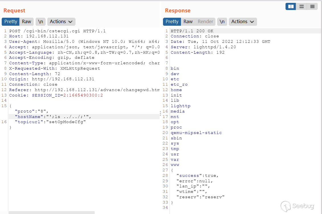 第一個是 /cgi-bin/cstecgi.cgi 中的 OpModeCfg 函數的命令注入漏洞,其漏洞原因是傳入的hostName參數,可執行到doSystem函數,通過簡單的構造即可導致命令執行。