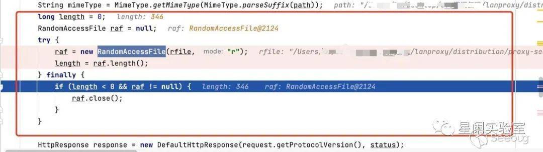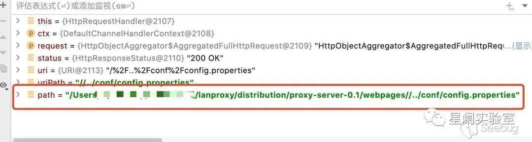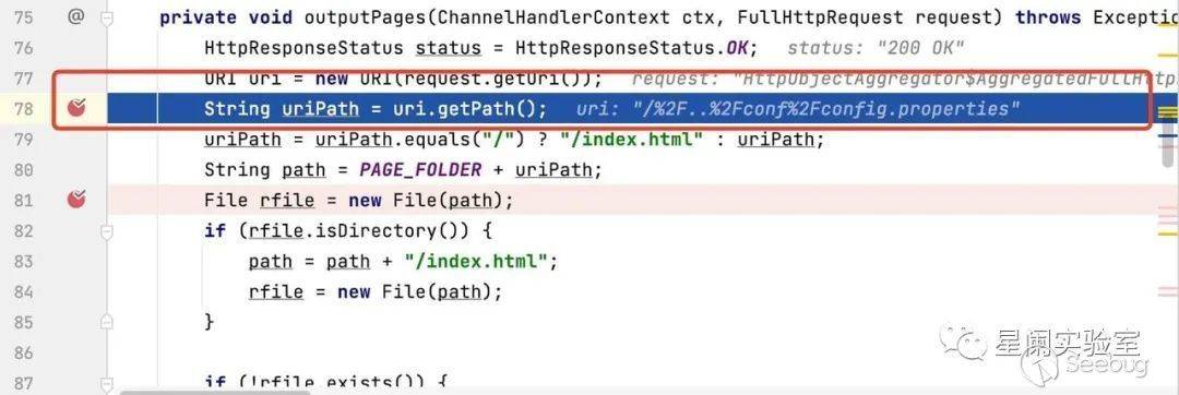 將斷點打到 src/main/java/org/fengfei/lanproxy/server/config/web/HttpRequestHandler.java#outputPages,先通過URI實例,獲取到uriPath(請求路徑):/%2F..%2Fconf%2Fconfig.properties