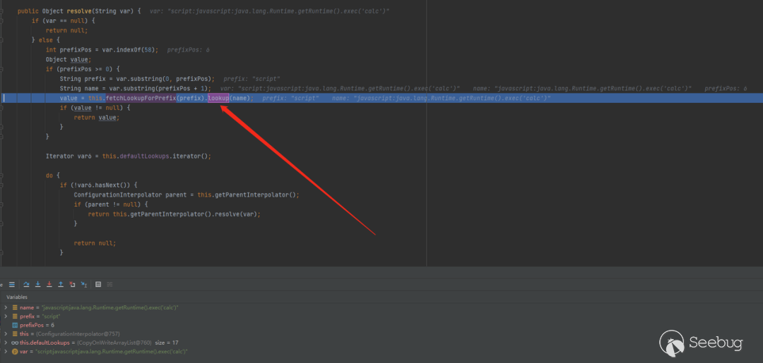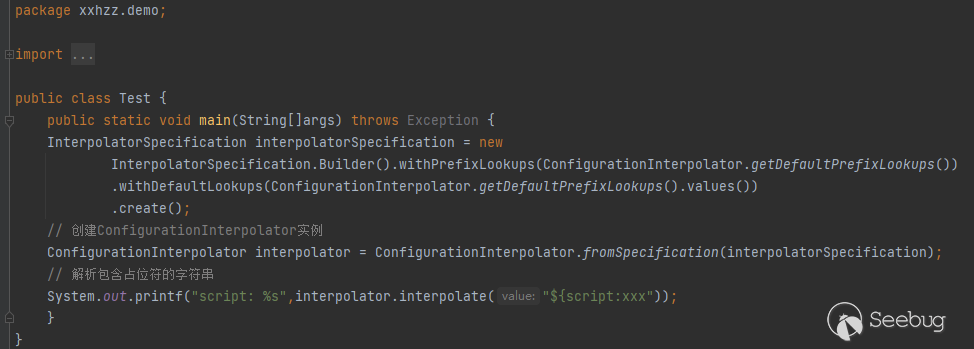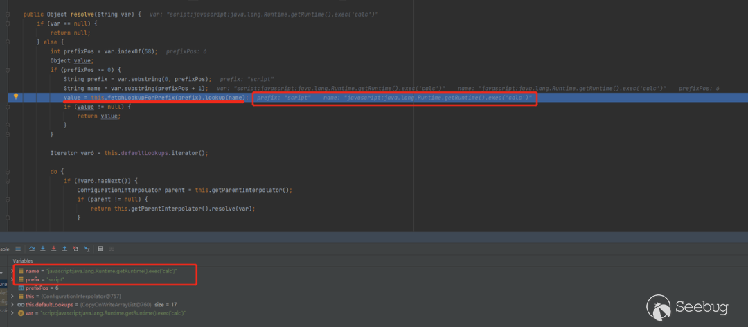 從漏洞通告中,可以得知Apache Commons Configuration執行變量插值,允許動態評估和擴展屬性。插值的標準格式是“${prefix:name}”,其中“prefix”用于定位執行插值的org.apache.commons.configuration2.interpol.Lookup 實例。