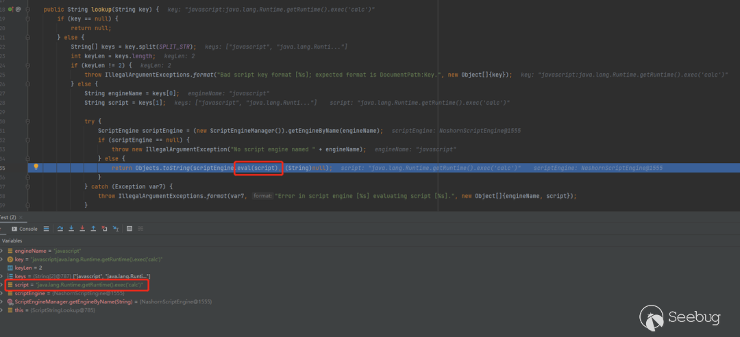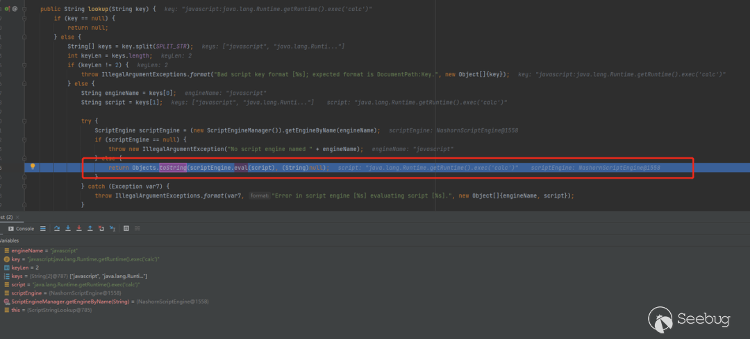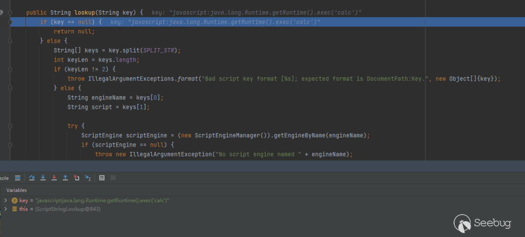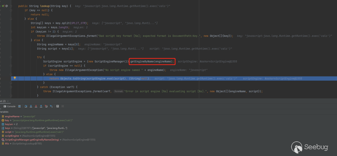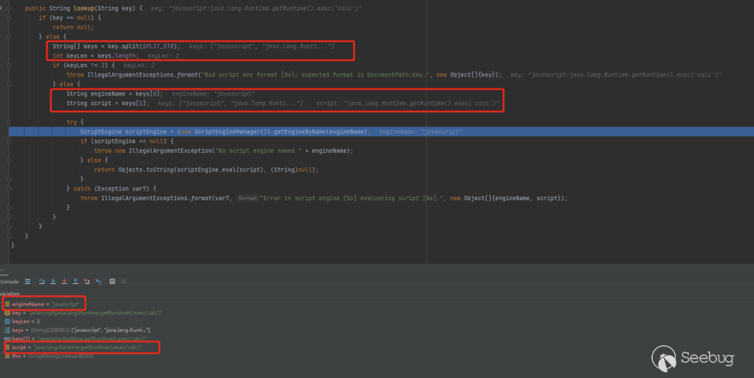 在org.apache.commons.text.lookup.ScriptStringLookup#lookup函數中會再次對字符串進行分割,分別提取engineName和script。