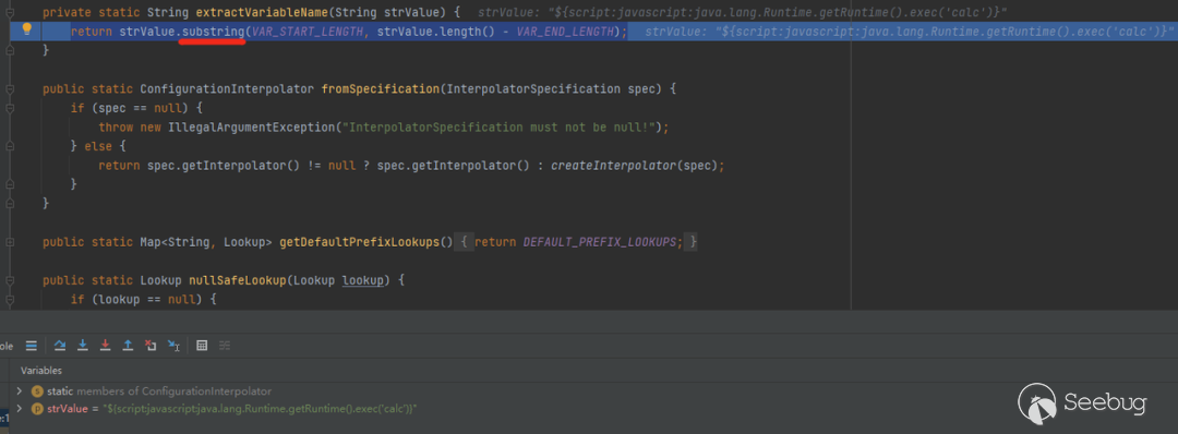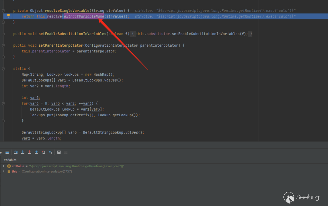 在org.apache.commons.configuration2.interpol.ConfigurationInterpolator#resolveSingleVariable中首先跟一下extractVariableName函數。