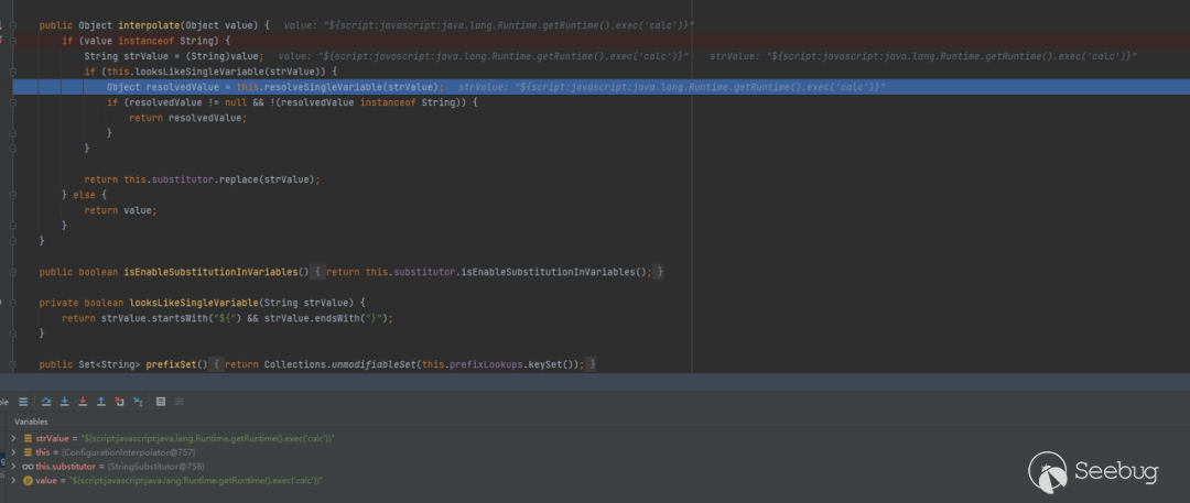 變量插值解析:在commons-configuration2中,負責對字符串中的變量進行解析的是org.apache.commons.configuration2.interpol.ConfigurationInterpolator類中的interpolate(Object)方法。