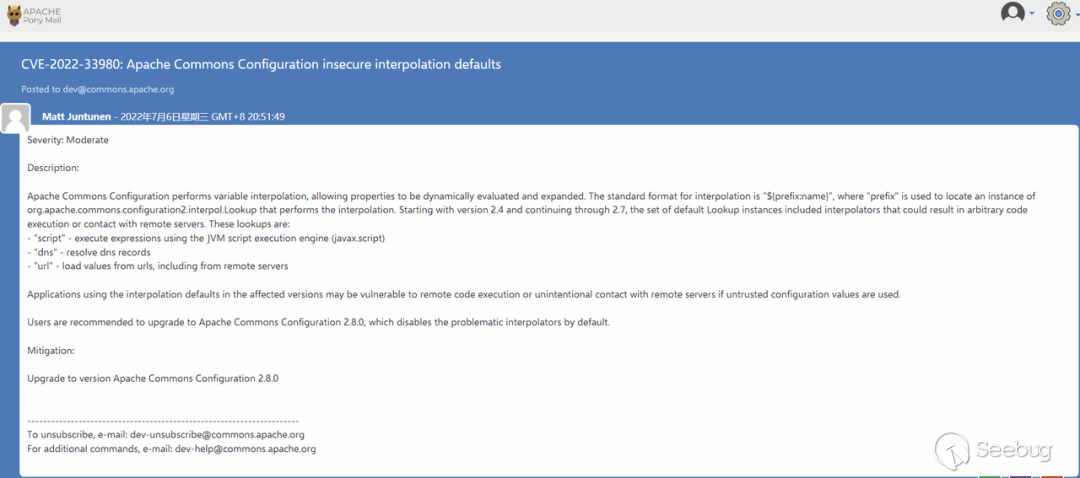 目前官方已發布修復版本修復了該漏洞,請受影響的用戶升級到 Apache Commons Configuration 2.8.0 版本。