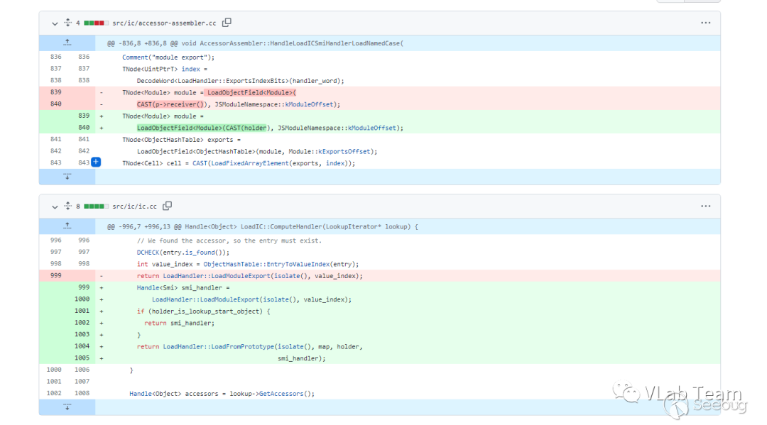 至此完整的調用鏈已經找到了,那根據此調用鏈,可以發現在第一次訪問屬性時,由于沒有FeedbackVector,會調用LoadIC_NoFeedback。假設lookup_start_object不是小整數且沒有被淘汰(被回收),那么就會調用GenericPropertyLoad,隨后再調用LoadNoFeedbackIC_Miss。在ComputeHandler中,發現修改的判斷分支檢查了holder是否在IsJSModuleNamespace,但是在HandleLoadICSmiHandlerLoadNamedCase中卻加載的是receiver,此對象并不在JSModuleNamespace中。所以當FeedbackVector被創建后,內部的IC中的類型記錄可能與真正調用時的類型不符,假設此時使用IC中儲存的對象類型調用JSModuleNamespace中的某些屬性,那么V8會根據FastPath使用IC中存儲的類型,但是由于receiver不是此類型,就會導致類型混淆。